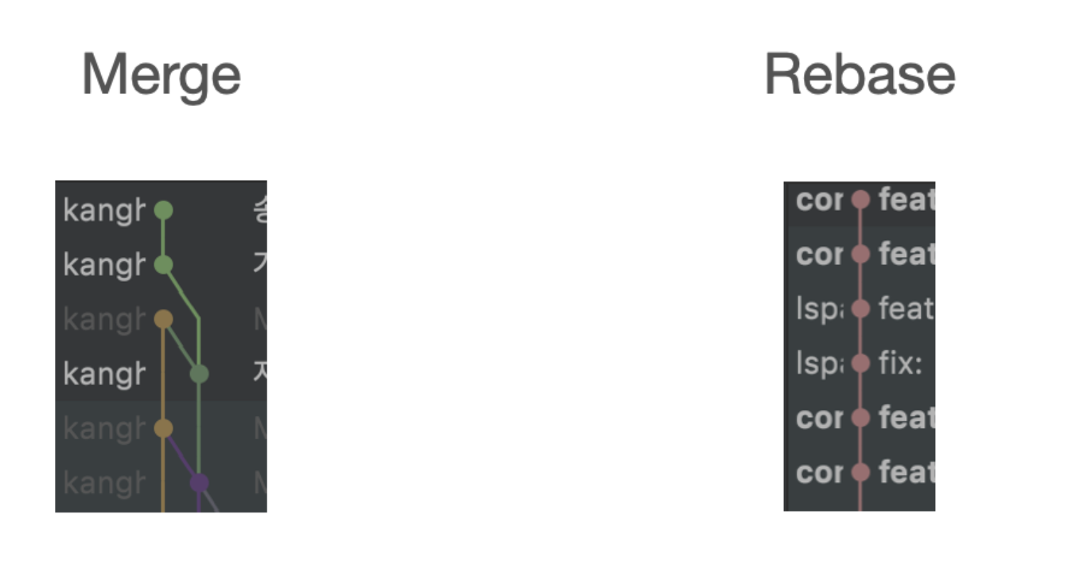 rebase commit은 한 브랜치에서 작업한 것처럼 보여 히스토리의 가독성은 좋지만 디버깅 시 변경사항을 세세하게 추적하는데 어려움이 있다.