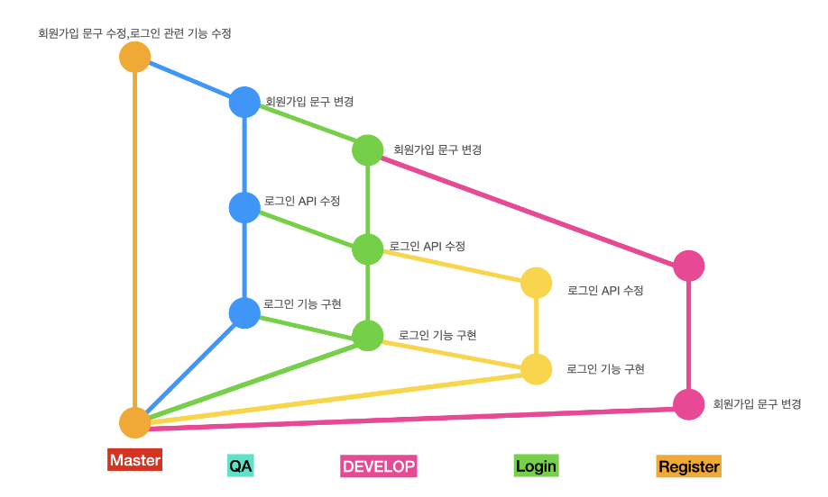 아래처럼 분기해서 작업하면 브랜치 병합이나 테스트 과정에서 대부분의 오류를 확인할 수 있기 때문에
