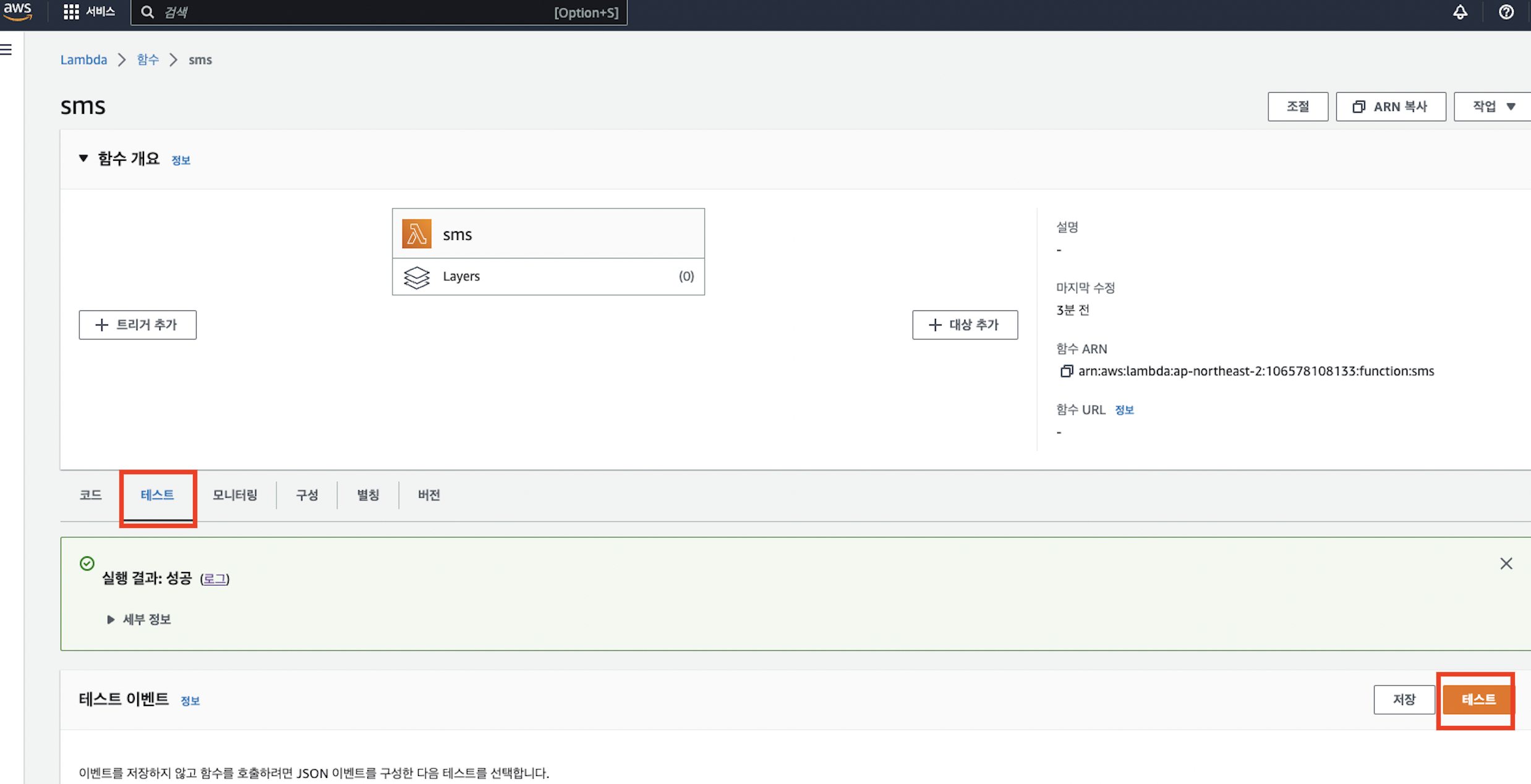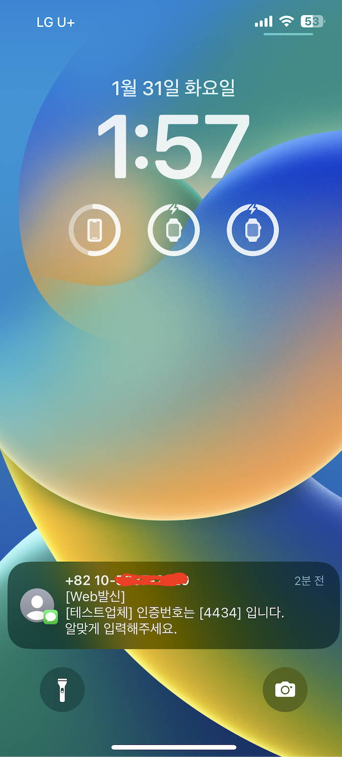 코드에 작성한 대로 값들이 잘 반환되었고 아래와 같이 문자도 잘 수신된 걸 확인했다.