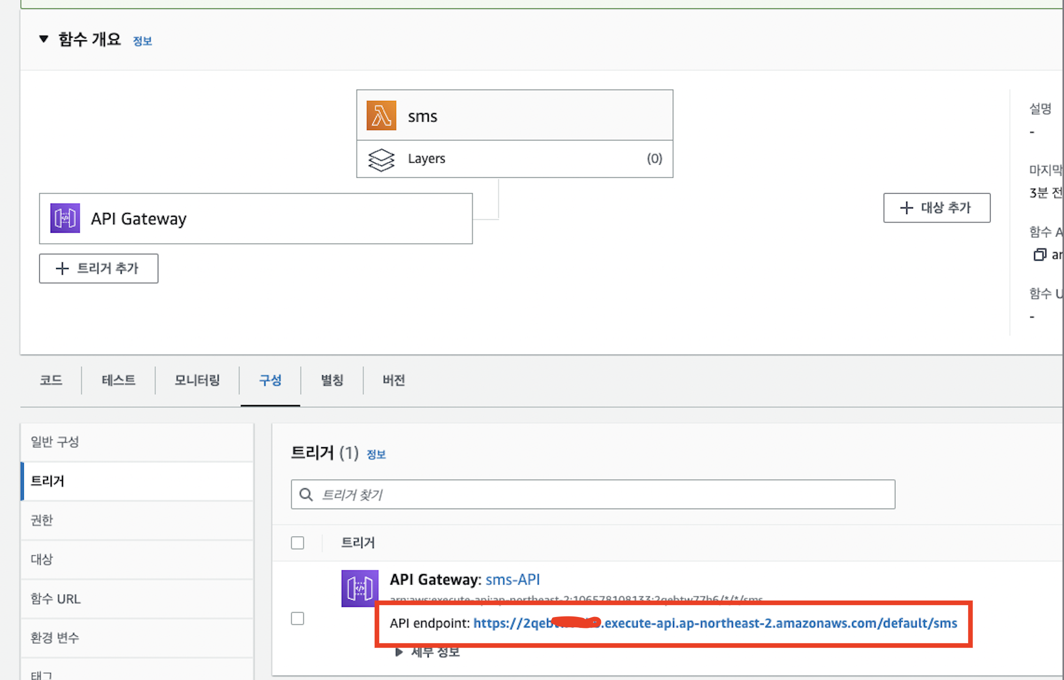 이제 위에 함수개요에 API Gateway가 람다와 연동된 게 다이어그램으로 표기되고 아래에 Api endpoint 주소가 나온다.