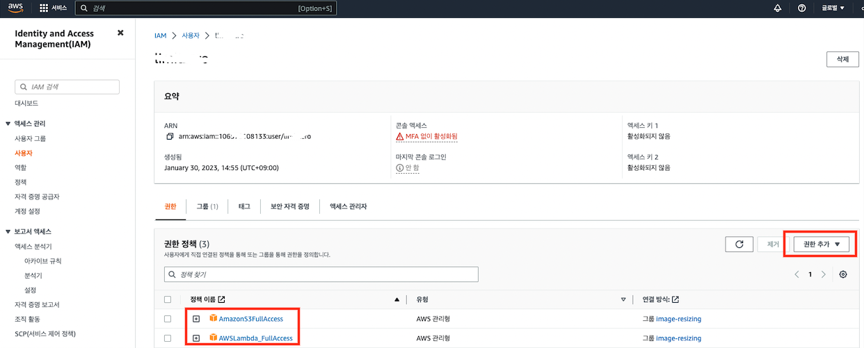 AccessKey로 사용자를 등록해 주었으니 이제 이 사용자가 S3와 람다에 접근가능하게 권한을 가져오자.