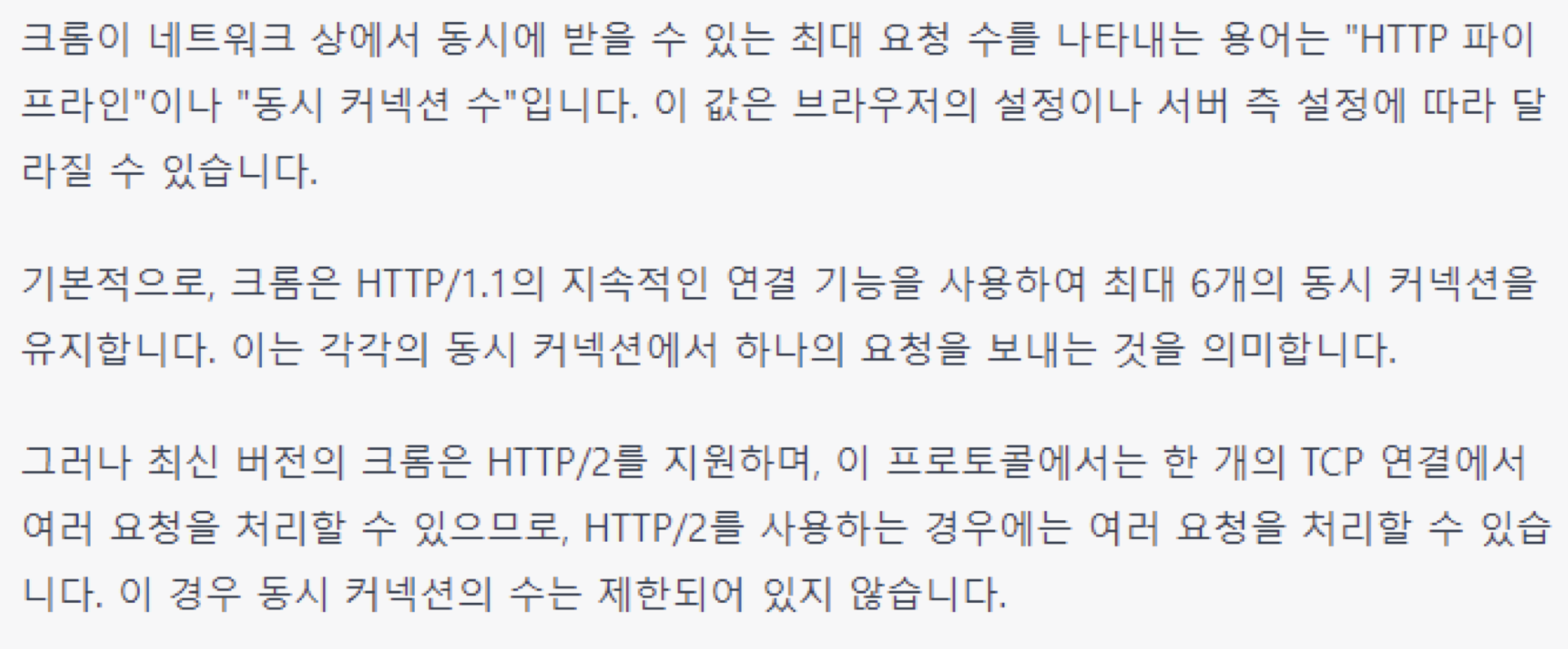 또 브라우저별로 네트워크상 동시에 커넥션 가능한 파이프라인의 개수가 한정되어 있어 파일이 많은 경우 한 번에 받을 수 없고