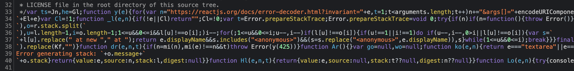 40번 라인에 문제의 코드가 나와야 하지만 빌드하면서 minify처리가 되어 브라우저상에서 빌드는 불가능해졌다.